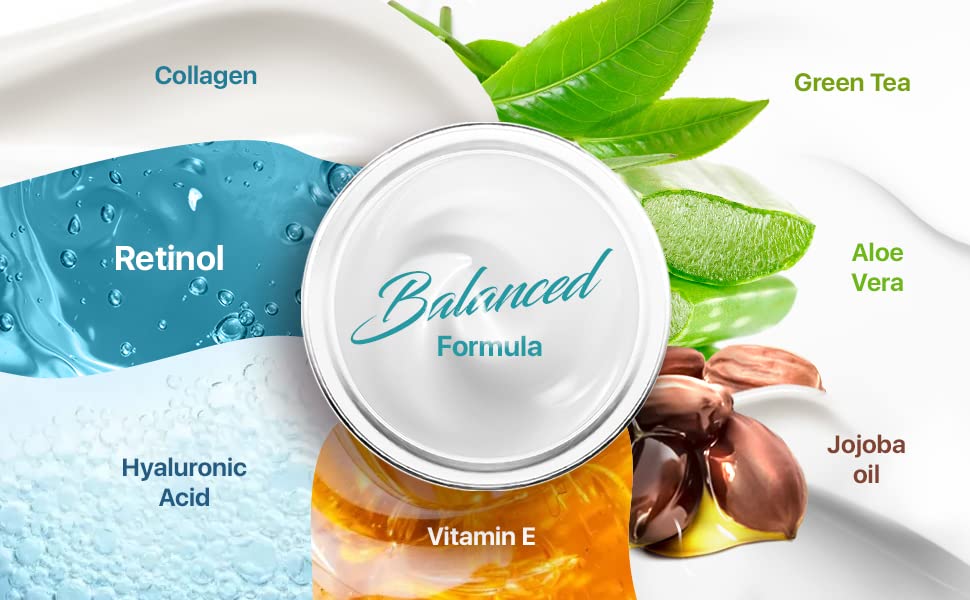 • Special formula: our face cream is made with thoroughly selected ingredients such as retinol for face, 5% hyaluronic acid, and collagen which create perfect combination to restore your skin elasticity; our retinol moisturizer is non-comedogenic and does not contain alcohol, gmo, gluten and paraben